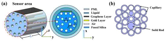 The PCF sensor is designed as seen in Figure 2. The cross-section of the D-type PCF sensor is shown in Figure 2a. The outer layer is the perfect matching layer (PML), and the second layer is the liquid layer (analyte). The material is fused silica, the yellow is the gold layer, and the black pattern is the graphene layer. The PCF structure consists of two air-hole rings. The first ring has two missing air holes and forms an asymmetric structure in the orthogonal direction of the fiber core and produces a birefringence effect. The air holes of the second ring are arranged in D shape with rotation angle of 30° between adjacent air holes. Designing a side-polish D-shaped plane over the PCF’s defect of the periodic air holes can effectively enhance the evanescent field. The smaller central air hole is designed in the sensor to make the evanescent wave penetrate the medium area and reach the metal–medium interface to excite more free electrons. On the other hand, it facilitates the phase matching coupling between the core-guide mode and the surface plasmon polariton (SPP) mode. In Figure 2a, the length of the sensing area is L = 1 mm, two adjacent air holes with diameter d = 0.4 Λ are placed with pitch size Λ = 1.8 μm, and the diameter of the scaled down air hole in the center is d1 = 0.2 Λ.