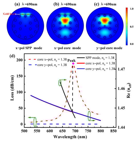 Figure 3d shows that the solid and dashed lines in different colors represent different meanings. The solid black line represents the real part of the effective refractive index Re(neff) of (a) x-pol SPP mode, the solid red line and the dotted red line represent the Re(neff) and the confinement loss of 3b x-pol core mode, respectively, and the solid blue line and the dotted blue line are Re(neff) and the confinement loss of Figure 3c y-pol core mode, respectively, which are at the wavelength of 690 nm. Figure 3a shows that in the x-pol SPP mode, there is almost no energy in the core and cladding, and all the energy is mainly concentrated near the gold layer, which cannot exist for a long time. Figure 3b shows the x-pol core mode. It can be seen that a large amount of energy from the core excitation to the cladding is coupled into the vicinity of the gold layer. At this time, SPR is the strongest. Figure 3c is the y-pol core mode. It can be seen that a large amount of energy is excited by the core to the cladding, but not coupled into the gold layer. That is because the y-pol core mode cannot produce the SPP mode, the mode field is only distributed in the PCF fiber. The reason is that when the electromagnetic wave propagates as a longitudinal wave in the metal at group velocity, it satisfies the phase matching, that is, the plasma frequency is equal to the evanescent wave frequency, and the corresponding excitation is the collective longitudinal vibration of the electron. At this time, the incident light is converted into SPW energy, resulting in a sharp decrease of reflected light energy and a confinement loss peak. Therefore, the x-pol SPP mode can excite SPR, indicating that the red dotted line corresponding to the intersection of the red solid line and the black solid line in Figure 3d has a peak value, while the y-pol SPP mode hardly excites SPR, indicating that the blue dotted line corresponding to the intersection of the blue solid line and the black solid line has no peak value. Therefore, the x-pol core mode is considered in the following discussion. COMSOL software can solve the effective refractive index of mode fields in a complex domain. The effective refractive index(neff) of the mode can be expressed as neff = Re(neff) + iIm(neff). The confinement loss can be obtained by Equation (8) [43]: