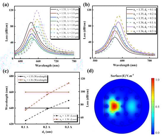 The PCF-SPR sensor’s sensing capacity also depends on PCF structural parameters, such as pitch, Λ, and holes diameter, d1, which are shown in Figure 4. The impact of pitch Λ on the spectrum of loss are displayed in Figure 4a. As the sample RI varies from 1.35 to 1.36, the loss peak moves to the longer wavelength and simultaneously raises the loss depth. When the sample RI is unchanged, the loss of the resonant peak position remains unchanged, with na = 1.35 at 635 nm and na = 1.36 at 655 nm. It is obvious that the loss depth is decreasing, meaning that in the fiber core, light is more constrained. The maximum loss peaks for naval values of 1.35 and 1.36 were observed at 635 nm and 655 nm at 90 and 118.9 dB/cm, respectively, with parameters of Λ = 1.8 μm and LG = 0. When Λ = 1.8 μm, the loss peak reaches the maximum and the SPR phenomenon is the most obvious. Therefore, the value of holes pitch Λ = 1.8 µm was selected as the optimal parameter of this design. Figure 4b,c analyzes the impact of the diameter of the smaller central air hole. For the increment in diameter d1, a related phenomenon is observed to appear as the Λ variance. It is clear that at d1 = 0.3 Λ, the maximum loss peaks are reached. The diameter d1 could not, however, be too high, leading to a reduction of the effective RI of the center of the fiber. The light would therefore leak from the core to the cladding area, which affects the efficiency of sensing. Therefore, d1 = 0.2 Λ was shown to be the optimized parameter and Figure 4d shows the optical field distribution for d1 = 0.2 Λ.