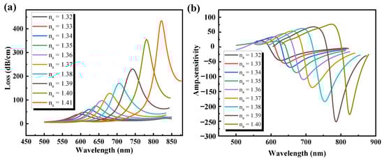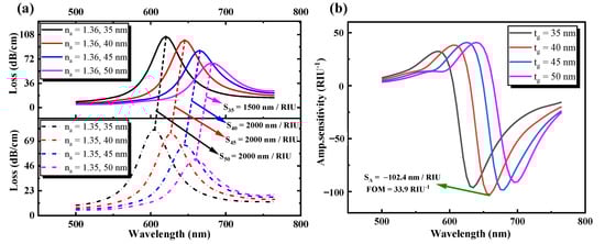 where ∆λpeak is the difference between the corresponding peak wavelength shifts, ∆na is the variation of the sample’s RI, α(λ,na) is the total loss of propagation at na’s RI, ∂na is the alteration of the medium’s RI to be calculated, and ∂α(λ,na) is the difference of loss between two loss spectra. When the thickness of the gold layer is 35, 40, 45, and 50 nm, Equation (11) calculates the sensitivity of the wavelength as 1500, 2000, 2000, and 2000 nm/RIU, respectively. The higher the sensitivity and measurement precision of the SPR sensor, the better will be the performance of the sensor. However, the measurement accuracy would be decreased too much by the full width at the half limit (FWMH) of the resonance loss peak. Therefore, a consistency factor (FOM) evaluation parameter is introduced [48], and FOM = S(λ)/FWMH. In accordance with the equation, FOM is 24.6, 33.9, 30.8, and 31.3 while the thickness of the gold layer is 35, 40, 45, and 50 nm, respectively. Figure 5b also shows that the amplitude sensitivity ranges from 35 to 50 nm with the gold layer thickness. It is clearly apparent that the designed sensor structure displays 96.2, 102.4, 98.3, and 91.1 RIU−1 amplitude sensitivities, respectively, determined by the Equation (12). The maximum amplitude sensitivity and FOM can be obtained when the gold layer thickness is set to tg = 40 nm. Therefore, tg = 40 nm was used in the whole process to ensure better sensing performance.