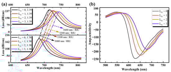 (a) Loss spectrum curve. (b) Amplitude sensitivity curve with different graphene layers from LG = 0 to 3.
