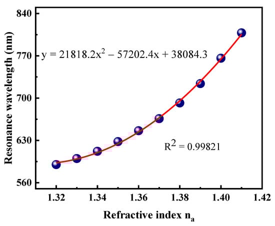 With the increase of RI, the change trend of the resonance wavelength is shown in Figure 8. For optimization of the sensor, the best polynomial fitting method is proposed. The polynomial fitting curve can be used to obtain the average sensitivity in the sensing range of 1.32–1.41. The red line in the figure represents polynomial fitting, and the blue balls are the resonance wavelengths. In the measurement range of 1.32–1.41, the correlation coefficient R2 = 0.99842 between sample RI and resonance wavelength. The corresponding polynomial regression equation is λ = 21174.2na2 − 55377.8na + 36807, where na is the sample RI.
