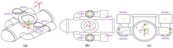 The additional information that is provided by Figure 1b,c regarding the position of the motors, with respect to the body–fixed reference frame, is used in the following paragraphs to define the dynamics of the mini-AUV.