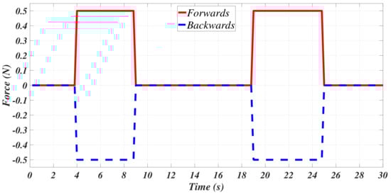The default properties of the water available on ANSYS CFX were used to simulate the behavior of the mini-AUV in [37]. The buoyant effect was activated, while the mini-AUV was simulated as an immersed solid with the properties provided in Section 2. The scaling function was set to 100, as suggested in [37]. The submerged body option was also selected, allowing to apply the force, Figure 3, in order to produce the forward and backward motion of the mini-AUV.