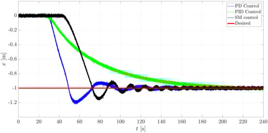 The controllers were designed with the mini-AUV hydrodynamic parameters when considering the control theory of robot manipulators exposed in [43]. For these ends, Equations (8) and (9) are cited, highlighting that the current analysis stands exclusively for the position control case, which implies that the desired point does not vary with time, such that .