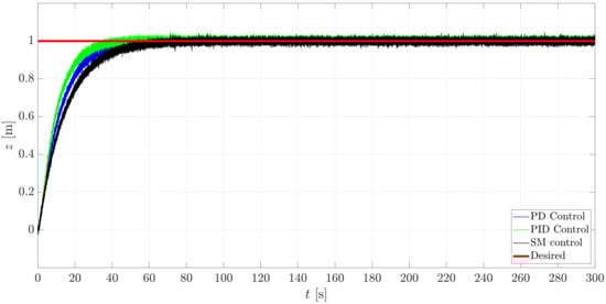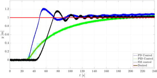 A brief survey on this topic gives evidence of the diverse techniques that were implemented to ensure the stability of underwater vehicles [23,24,25,26], being the PD and PID controllers, with different variations, the most commonly adopted. The aforementioned controllers have been implemented in order to accomplish tasks as depth control under continuous waves conditions [27,28,29,30] or the path following adversarial environmental conditions [31]. Nonetheless, robust control techniques have been adopted in order to improve the behavior of the system, as in [32,33,34], where the corresponding authors show the effectiveness of the Sliding Mode Control (SMC) applied over these vehicles, extending the capabilities of the theory to the observation domain [35]. Moreover, some techniques [36] consider an iterative identification method to estimate the parameters of the system and the design of the controller at the same time.