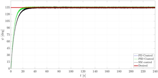 The integral action of the PID control law in Equation (26) introduces an additional state variable that is denoted herein by , and whose time derivative is , leading to:
