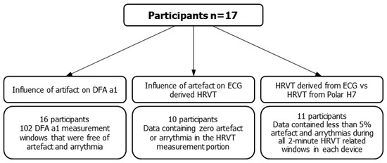 All participants had Polar H7 recorded RR series analysis by Kubios software. HRVT and artefact percentage was determined using the above-mentioned technique. To achieve a sufficient sample size for meaningful comparison, the following limits to artefact were set for study inclusion. Both the Polar and ECG derived data contained less than 5% artefact during all 2-min HRVT related windows, which yielded 11 participants who met these criteria. A summary of each inclusion criteria is shown in Figure 1.