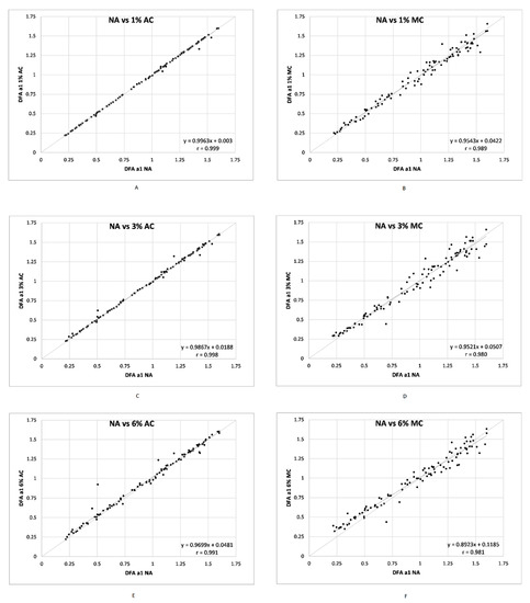 Regression plots for all ECG derived DFA a1 NA vs. DFA a1 for each artefact condition and correction method. (A) vs. DFA a1 1% AC; (B) vs. DFA a1 1% MC; (C) vs. DFA a1 3% AC; (D) vs. DFA a1 3% MC; (E) vs. DFA a1 6% AC; (F) vs. DFA a1 6% MC. Bisection lines in light gray. Slope and Pearson’s r shown in bottom right of each plot.