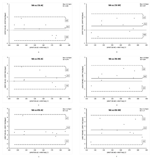 Bland Altman analysis of ECG derived HRVT NA vs. HRVT for each artefact condition and correction method. (A) vs. 1% AC; (B) vs. 1% MC; (C) vs. 3% AC; (D) vs. 3% MC; (E) vs. 6% AC; (F) vs. 6% MC. Center solid line in each plot represents the mean bias (difference) between each paired value. The top and bottom lines are 1.96 standard deviations from the mean difference. Net bias with standard deviation (SD) in top right portion of each plot with standard deviation (SD) in top right portion of each plot.