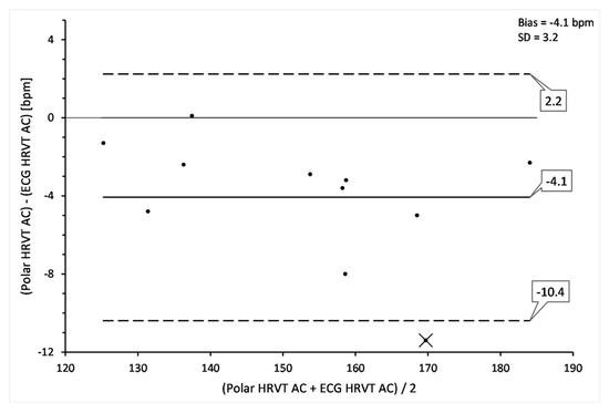 Comparison of heart rate at HRVT between ECG vs. Polar H7 data using Bland Altman analysis. The one outlier (labeled as X) represents the only participant with no artefact in both ECG and Polar H7 time series. Center line represents the mean bias (difference) between each paired value. The top and bottom lines are 1.96 standard deviation from the mean difference. Bias and standard deviation (SD) listed in upper right corner.