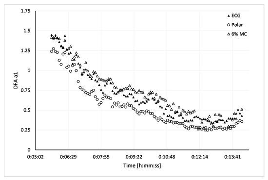 Time-varying analysis (window width: 120 s, grid interval: 5 s), DFA a1 for matched time series containing no artefact in one representative participant, ECG (solid triangle), Polar H7 (open circle), ECG 6% MC (open triangle).