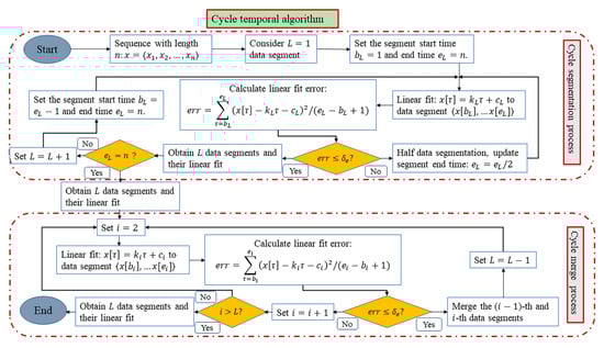 The CTA process is divided into a cycle segmentation process and a cycle merge process. For the cycle segmentation process, according to the entire data sequence , is set as the data segment start, the segment start point and the end point are set, and a linear fitting is performed on the segment. The fitting equation is , where and represent the slope and the y-axis intercept, respectively. If the linear fitting error is greater than the extracted threshold , the sequence is halved. The linear fitting of the first half of the sequence is repeated until the linear fitting error is not greater than the predetermined error threshold . First, it is determined whether the end of the segment reaches the end point, and then, it is determined whether the data are divided into segments. The linear fitting calculation is expressed in Equation (12).