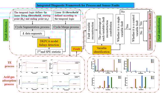 The integrated fault diagnosis framework for process and sensor faults is mainly composed of two parts: fault detection and fault identification. Through the fault detection step, various faults in the system are accurately and rapidly detected. Fault identification involves identifying specific fault variables by reconstructing the variable diagram method for the detected fault and distinguishing the fault types by using the process and sensor fault characteristics.