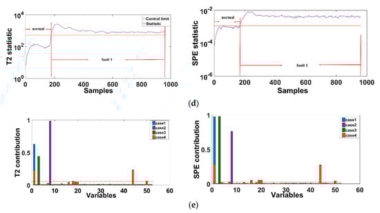 Figure 8a–d shows the fault detection results of the CTA-DKPCA model in the principal component subspace () and residual subspace (SPE), respectively, where (e) is the fault identification results of principal component subspace and residual subspace based on RBC. The statistic represents the macro situation of the system, that is, when there is a fault, the system can reflect the observable fault. SPE statistics represent the deviation from the normal situation in the system, that is, when the deviation occurs in the system, the normal error situation will be displayed in SPE statistics. So we can see that for the detection sensitivity of the residual subspace, the residual subspace represented by the SPE statistic is higher than the principal subspace represented by statistic. For the contribution rate of the two subspaces, the principal component space shows the macro fault condition of the system itself, and the residual subspace shows the error of the system, so the contribution rate is less than the SPE contribution rate. The error variable is observed through the SPE contribution rate, and then the contribution rate is determined as the main macro fault variable of the system.