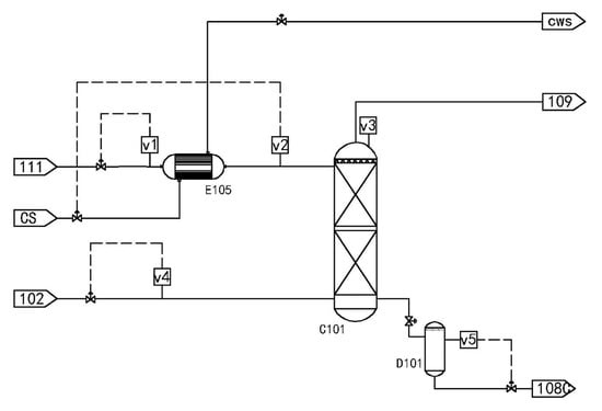 Stream 111 is the absorbent MDEA. It first exchanges heat with cooling water at room temperature through the heat exchanger E-105 and is then cooled to 21 °C, and then enters the absorption tower C-101 from the top. The raw material gas stream 102 enters the absorption tower C-101 from the bottom, flows counter currently with the absorbent MDEA, and absorbs acid gases (H2S and CO2) from the natural gas. The overhead gas of the absorption tower C-101 is natural gas containing a large amount of moisture, and then it enters the downstream dehydration system for further dehydration and purification to meet the national natural gas standards. The bottom product of the absorption tower C-101 is rich amine liquid containing acid gas. After heat exchange, the rich amine liquid enters the regeneration tower to resolve acid gas and regenerate the absorbent. According to the Piping and Instrument Diagram (P&ID) chart, the following variables: V1: absorbent MDEA volume flow rate, V2: absorption tower absorbent feed temperature, V3: absorption tower top pressure, V4: Natural gas feed flow, V5: Bottom liquid level height of absorption tower.