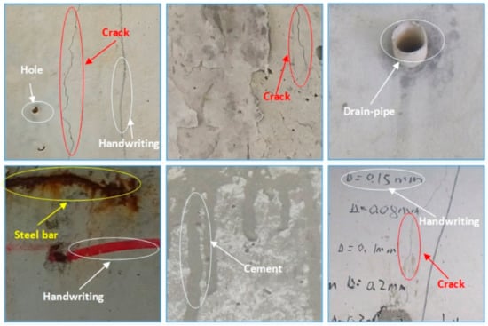 Different from cracks in ordinary pavement, the cracks at the bottom of a bridge are smaller and the influence of other features is larger, as shown in Figure 1. These features mainly consist of holes, exposed and rusted steel bars, drain-pipes and traces of uneven cement. Some of these noises are similar in shape to cracks and are easily detected as cracks by mistake. In addition, pen marks are used to indicate the cracks when the images are collected, which also have a high degree of similarity with cracks. Due to the complexity of the various features, most crack detection algorithms are not accurate and effective enough. As a result, the automatic detection of the length and width of cracks on bridge pavements is a challenging task. Deep learning algorithms are used to detect bridge cracks mainly because of their robustness and learnability. Robustness means that the deep learning algorithm has a stable ability to extract features of cracks from the images, and then identify and locate cracks according to these features. This study aims to accurately detect cracks and exposed steel bars in complex environments using deep neural networks. Deep learning has two apparent advantages in damage detection: robustness and automation [20]. Robustness refers to the ability to stably extract features from images, and then to identify and locate damaged areas based on these features. Automation means that the feature extraction process is automatic or semi-automatic. With these two features, deep learning can distinguish different types of damage from the background in images. Therefore, it is appropriate to identify bridge cracks and steel bars using deep learning methods.