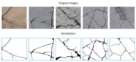 Yang et al. [34] collected more than 800 crack images of concrete pavement, and here we use this crack dataset to verify the effectiveness of the proposed method. The original images were formatted as JPG, while the resolution ranged from 72 to 300 dpi. Figure 2 shows some samples of this dataset, where the morphology of the cracks is varied, but the noise in this data set is relatively low. In the ground truth images, the white area with the pixel value of 0 represents the background, and the black area with the pixel value of 255 represents a crack.