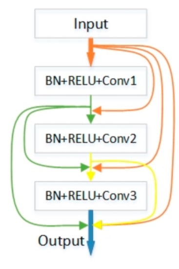 where represents the channel-wise concatenation of the feature-maps produced in layers , and refers to the operation of the sequence BN-ReLU-Conv. The DenseNet enhances gradient back propagation due to dense connections, making the network easier to train.
