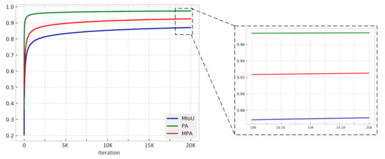 The MIoU, PA and MPA of the proposed EMA-DenseNet on the public crack dataset during each iteration, the figure on the right is a magnification of the interval on the left.