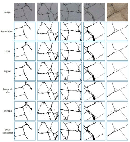 Several images were randomly selected from the test set for detailed comparison, Figure 8 presents the visual comparisons of the crack detection results using these five methods. All the images in the first row are the original images to be detected, the second line are the manually annotated images and the following are the prediction results of different methods. A total of five different crack images were selected, and the fracture morphology in each image was relatively complex. It can be seen from Figure 8 that the EMA-DenseNet is a more powerful network, which makes it better for noise processing. The experimental results show that these methods can detect cracks well, but the predicted crack pixels of SegNet and FCN are discontinuous. On the other hand, the prediction results of SDDNet and DeepLab v3+ algorithm contain many noise points, while the proposed EMA-DenseNet is closer to the ground truth.