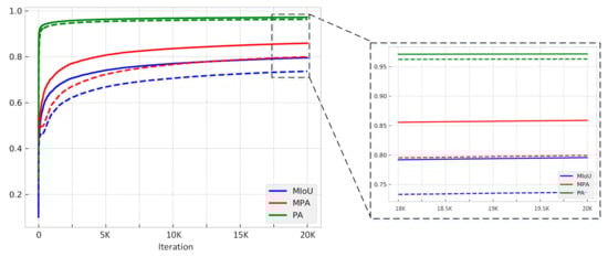 The MIoU, PA and MPA of the proposed EMA-DenseNet on our bridge damage dataset during each iteration, the solid lines indicate the proposed networks with EMA module, and the dotted lines represent networks without EMA modules.