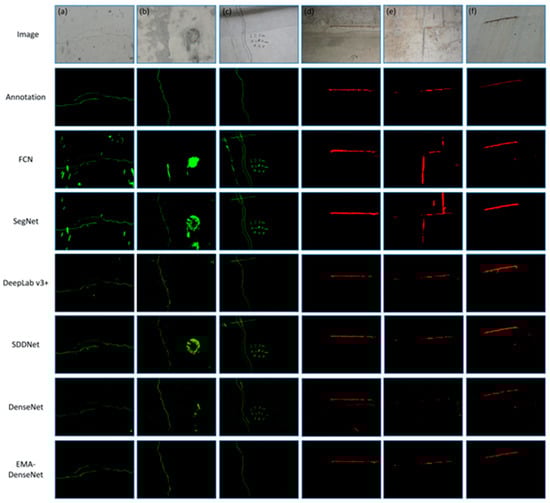 Some sample images in the test set are used to further analyze and compare, the original images and predictions of different methods are shown in Figure 10. As can be seen from the original image, the bridge images are particularly fraught with interference factors. Most of the noise in these images is spots, which are easily mistaken for cracks by traditional methods. This dataset can reflect the advantages and disadvantages of each method. Figure 10a–c are the crack images, and the Figure 10d–f are the steel bar images. It can be clearly seen that many algorithms are not effective in detecting the bridge damage. For example, when the FCN and Segnet detected cracks in Figure 10a, some spots that are not cracks are detected as cracks. There are some lines and words beside the cracks in Figure 10c, which are very similar to the crack. The FCN, SegNet and SDDNet mistakenly recognize some lines or words as cracks, while the DeepLab v3+ and the proposed EMA-DenseNet accurately detected the cracks. Among the six images, the easiest to detect is Figure 10d. Although there are some noise points around the exposed steel bar, the damage area is more obvious and easy to detect, so all the methods have good detection. The rebar in Figure 10e is also not easy to detect, FCN and SegNet detected some cement traces as rebar. The prediction results of DenseNet without EMA module are also given here. The performance of DenseNet were also good, but there were a lot of noise. The damage region predicted by EMA-DenseNet is more complete and has less noise. By comparing the two cases, it can be found that the application of EMA module greatly improves the performance. The prediction results show that the proposed method has better noise processing ability and robustness in the case of simultaneous identification of multiple damages. It should be acknowledged that some damage segments are still not correctly identified in our method, the effective solution is to increase the number of images in the training.