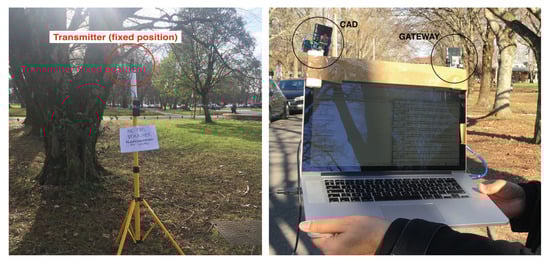 The CAD tests are realized in the University of Pau (France) area. It is a typical terrain in the university with some low buildings and trees. A transmitter was placed on a tripod in a fixed position. LoRa data rate is initially set to SF12BW125 (spreading factor of 12 and bandwidth of 125 kHz), and the LoRa radio module was the SX1276. The choice of SF12 provides the longest time-on-air to test the CAD procedure. A CAD device continuously realizing a CAD procedure every 1000 ms and a simple receiver (denoted in the figure as gateway, but it is a more simple device than a gateway with a radio concentrator) were connected on a laptop computer as shown in Figure 2. The preamble length is set to the default value which is symbols. Depending on the data rate, the preamble duration will therefore vary according to the symbol time. For SF12BW125, it is about 400 ms.