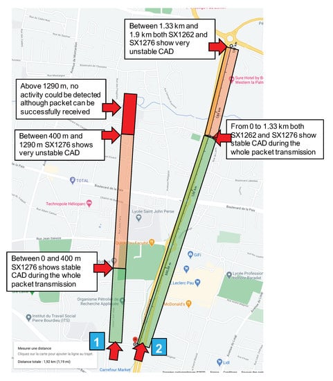 In CAD experiment 2, for the first 1.3 km, both CAD devices detect the ongoing transmission in a very stable way: the red LED was ON during the whole packet transmission. Between 1.33 km and 1.9 km, the CAD procedure varies from unstable—there have always been at least one successful CAD during a transmission, therefore a behavior similar to the one illustrated in Figure 4—to very unstable where some packet transmissions could not be detected at all by both devices. The main results of CAD experiment 2 is that we unfortunately did not observe any significant difference between the SX1276 and the new SX1262.
