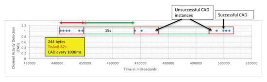 The transmitter node sends long packets of 244 byte (240 bytes payload + a 4-byte application-level header) every 15 s. The ToA of the packet is 8.69 s. The test setting is illustrated in Figure 3, and the experiment is referred to as “CAD experiment 1”, indicated by the blue square marked “1”.