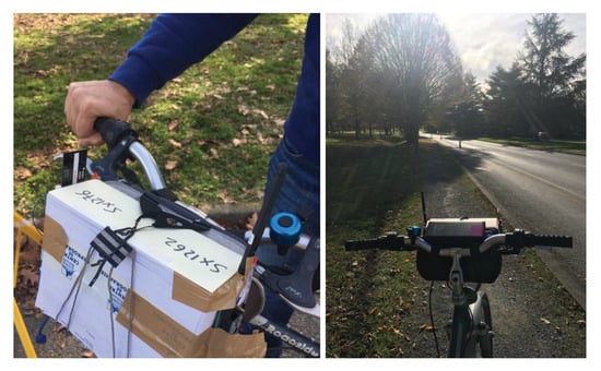 CAD experiment 2 uses the same setting (SF12BW125) for the fixed transmitter positioned as illustrated in Figure 3, the red arrow close to the blue square marked “2”. The transmitter position has been changed to be able to test along a longer path with less obstacles than for experiment 1. Two devices performing continuous CAD have been programmed, one with the previously used SX1276 and the other with the new SX1262. These two devices are fixed on a box put on a bike in order to be able to move faster and further on the bike lane. Each device has a red LED that is switch ON and OFF according to a radio activity detection or not. Here, the continuous CAD procedure is realized every 100 ms. , and are set to their optimal value as recommended by Semtech in []: , and . The experiment setting is illustrated in Figure 5.
