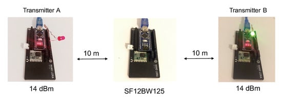 Our first experimentation setting consists of a very simple scenario to better catch Capture Effect property in a real LoRa deployment. We start with two transmitters (transmitter A and transmitter B) and one receiver (acting as gateway) as depicted in Figure 6: transmitter A and transmitter B are at about 20 m distance from each other, and the gateway is placed approximately in the center of the two nodes. The first set of tests is performed in LOS conditions.