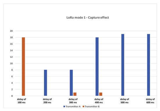 We realized multiple runs of 20 packet transmission cycles. We started the test with a delay of 100 ms between transmitter A and transmitter B: if is the transmission time at transmitter A, transmitter B will send its packet at . will be incremented to 200 ms, 300 ms, 400 ms, 500 ms, and 600 ms. Note that a delay of 400 ms or greater will avoid concurrent transmission during transmitter A packet’s preamble in the SF12BW125 data rate. We expect to receive one packet per packet transmission cycle that would show the efficiency of the capture effect.