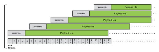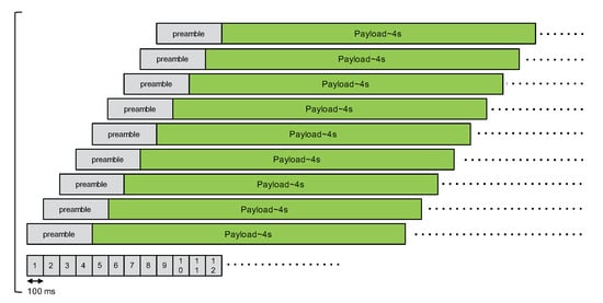 In case B, we have one master node and four slave nodes that will transmit successively after the packet’s preamble, as illustrated in Figure 9, respectively, with a delay of 500 ms, 1000 ms, 1500 ms, and 2000 ms compared to the packet from the master.