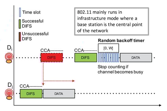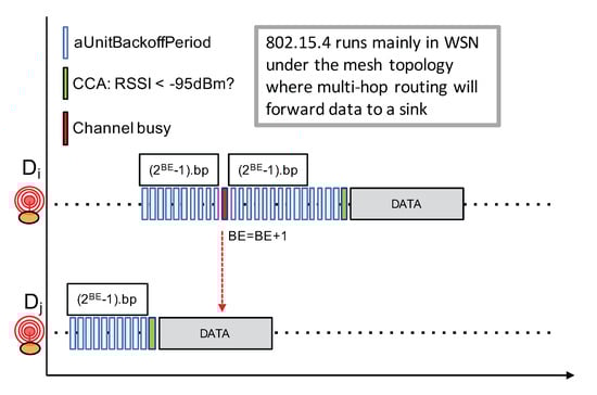 The CSMA procedure in IEEE 802.15.4 always forces a backoff timer prior to any packet transmission when compared to IEEE 802.11 CSMA. In addition, IEEE 802.15.4 does not implement a continuous sensing of the channel to detect when the ongoing transmission ends. The exponential backoff procedure in IEEE 802.15.4 simply increases BE—thus the backoff timer internal, from one attempt to another when trying to transmit the same packet. These differences between IEEE 802.15.4 and IEEE 802.11 have their reasons. First, the continuous sensing of the channel to detect when the ongoing transmission ends is very costly in terms of energy, especially when the time-on-air of a packet is long. This is the case for IEEE 802.15.4 as it usually transmits at 250 kbps while IEEE 802.11’s throughput is well beyonds 50 Mbps. As IEEE 802.15.4 radios are more dedicated to small battery-operated devices, the approach to simply increasing the backoff timer interval is far less energy consuming. The second reason is related to both node density and traffic load: IEEE 802.15.4 networks are expected to less denser and less busier than WiFi networks. In addition, as the IEEE 802.15.4 for Wireless Sensor Networks or IoT mainly runs under the mesh topology (i.e., P2P and without any central coordinator) with a shorter radio range (i.e., lower transmit power), the spatial reuse is therefore higher. This contributes also to reducing the traffic load in the network.