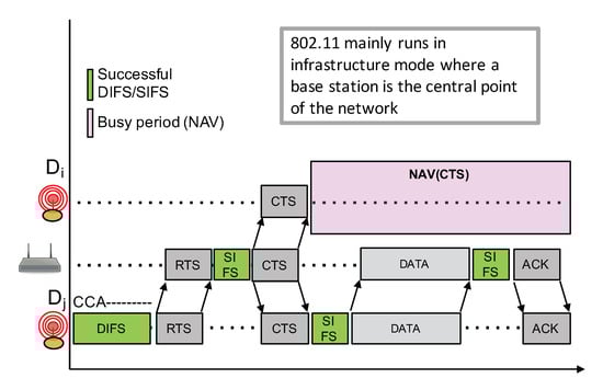 - If radio activity has not been detected during a DCF inter-frame space (), the node can proceed with the transmission. This is illustrated by a green );