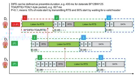 A node willing to transmit a data packet will either start by listening for an RTS with probability (phase 1) or start directly by sending an RTS with probability P (phase 2). By choosing P with a small value such as 0.1, only 10% of transmitters will actually start by claiming for the radio medium. The other transmitters will then listen for the RTS. In Figure 13, node will start by listening while nodes and start by trying to send an RTS. Prior to the RTS transmission, a random backoff timer expressed in number of is applied in order to further separate transmitter nodes starting directly in phase 2. The number of is taken in range . As is set to the packet’s preamble duration (which can be about 400 ms in data rate SF12BW125), W should not be too large and a value such as 7 can provide a sufficient transmitter separation property.