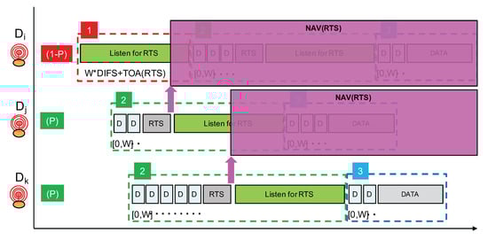 If we look back at the scenarios depicted previously in Figure 8 (case A) and Figure 9 (case B), we can see that the proposed approach can nicely handle the concurrent transmissions. In case A where there are about nine nodes transmitting in a small time window, the proposed approach will first apply a filter with probability P. Therefore, with , out of the nine nodes, there will be probably one or two nodes maximum that will start directly at phase 2. Assuming two nodes starting at phase 2, j and k for instance, these nodes will compete for the medium with the random backoff timer as illustrated in Figure 13. The node with the largest backoff timer will be able to send its packet, while the other one will go into a NAV phase. Here, it is node k as illustrated in Figure 14. All the other nodes will start with phase 1 and will move into the NAV phase to defer their transmission upon reception of an RTS packet—normally the one sent by node j.