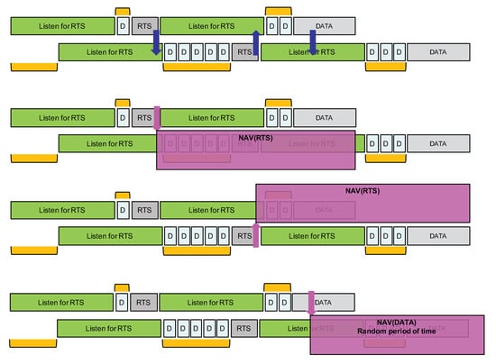 For case B, it is highly possible that all nodes start with phase 1. As depicted in Figure 15, there are several random delay components that will maximize the probability of receiving an RTS within a listening period in order to move into corresponding NAV periods. These delay components are indicated with orange blocks. It must be noted that, when a node finally transmits a data packet, other nodes that are in their listening period can also receive the beginning of the LoRa packet, see Figure 15 bottom figure. For a packet reception, a LoRa radio actually provides a ValidHeader interrupt and an RXDone interrupt. As the ValidHeader interrupt is part of the LoRa packet reception RF chain, it is more reliable than a CAD procedure—recall that LoRa can receive and decode packets below the noise floor. Therefore, upon reception of the ValidHeader interrupt for a data packet (and not for an RTS), a node in its listening period can also differ its packet transmission by a random period of time, in a similar way than if an ongoing LoRa transmission has been detected.