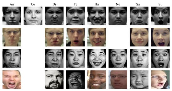Samples of different expressions from four databases. From top to bottom is the Extended Cohn–Kanade database (CK+), Oulu-CASIA, Japanese Female Facial Expressions database (JAFFE), and RAF-DB. An, Co, Di, Fe, Ha, Ne, Sa, and Su stand for Anger, Contempt, Disgust, Fear, Happiness, Neutral, Sadness, and Surprise, respectively.