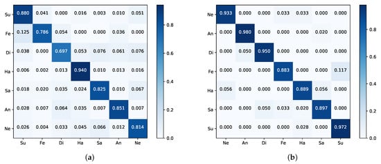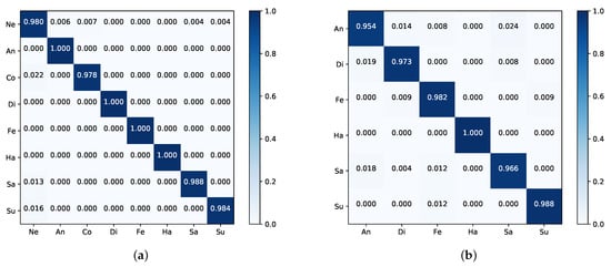 Figure 4a is the confusion matrix on the CK+; here, we only express the eight-class FER problem. From Figure 4a, we can know that our method performs well on anger, disgust, fear, and happiness; contempt expression is the most difficult to classify due to having the lowest recognition rate. One possible reason is that contempt expression has the least amount in CK+, in addition, the way people express it is very elusive.