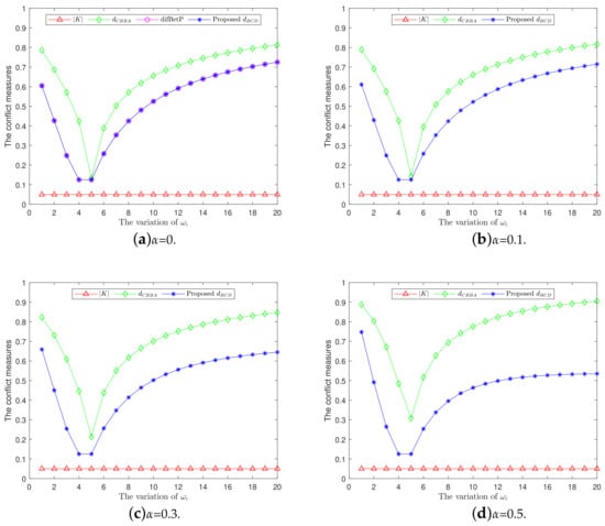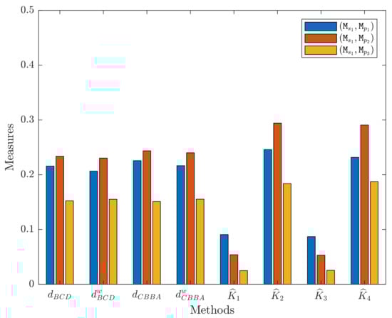 - For , it can be seen that it can measure well the conflict between CBBAs in Case 1 and Case 2 with values of 0.84 and 0.264, respectively. However, cannot distinguish the difference among the CBBAs in Case 3 with a measure value of zero.