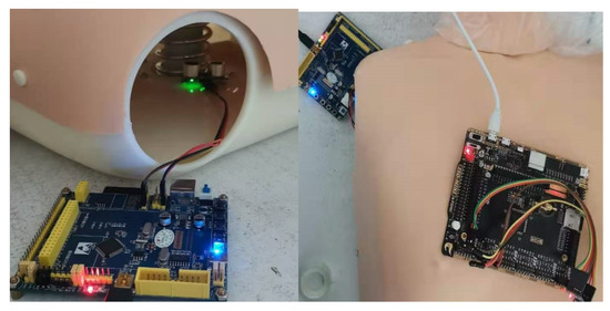 To obtain the normal and abnormal CC signal data for the experiment, a CC simulation system was designed to collect acceleration data during CC process. The entire compression data acquisition system is shown in Figure 1; it can be divided into four parts: the simulation device, control module, measurement module, and sensor module. The simulation device can simulate the different pressure waveforms generated by the compression simulation process. The control module conducts data analysis, processing, and archiving. All compression data are recorded on a digital memory (SD card). The measurement module obtains the computed distance values to compare them against the results acquired using the classification methods. The sensor module conducts compression information monitoring and measurement when compression is performed to collect acceleration data from the CC process. In the sampling process, a stm32 and an ADXL345 hardware, and a v-wo smart watch with a bm250 three-axis accelerometer are used as two combinations. ADXL345 is a small, ultra-thin, ultra-low power consumption, 3-axis accelerometer with a maximum resolution of (13-bit) measurement of ±16 g. The accelerometer bm250 is similar to ADXL345, but uses a 10-bit binary value. We use the ADXL345 to obtain simulation data and then transplant the trained model to the smart watch for verification. The acquisition setting are shown in Figure 2.