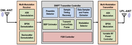The proposed architecture of the SWIPT transmitter is shown in Figure 1. It mainly consists of three main blocks which are multi-modulation receiver (MMR), SWIPT transmitter controller (STC), and the multi-modulation transmitter (MMT). The MMR supports multiple modulations that can be used depending on the channel condition and harvesting power available at the receiver. In the proposed SWIPT system architecture, the STC acts as a SWIPT system controller which takes decisions according to the energy harvesting status at the SWIPT receiver. Its main goal is to maximize energy transfer while keeping high data communication throughput. Due to adequate power at the transmitter, STC is controlling the overall operation of SWIPT to increase reliability. The STC consists of multiple blocks to control the SWIPT operation and performs communication. The preamble detector detects the preamble in the received data. The sample timing recovery block recovers the sampling timing from the preamble in the received data. The data sampler and frame extractor extracts the bytes from the received data and classifies the received frame. The boost burst period (BBP) estimator block momentarily increases the RF power to allow for the fast charging of supercapacitor at the SWIPT receiver. The finite state machine (FSM) controller controls the operations in the STC according to the adaptive control and communication protocol (ACCP). The modulation selector block selects the modulation depending on the channel condition and energy harvesting at the SWIPT receiver. The SWIPT transmitter has a variable RF power controller for controlling transmitted RF power. The uplink antenna (UPL-ANT) is used to transmit the RF power and data to the SWIPT receiver. A downlink antenna (DNL-ANT) is used to receive the data signals from the SWIPT receiver.
