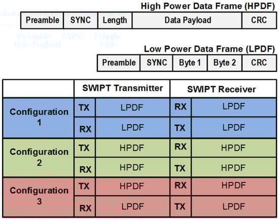 The low power data frame (LPDF) and high power data frame (HPDF) consist of a preamble, sync, type of frame, number of bytes, data bytes and cyclical redundancy check (CRC). The difference between the high and low power frames is a greater number of data bytes in the high power frame. In the case of the LPDF, the bytes field number is skipped and only two data bytes are transmitted. In the case of HPDF, the bytes field number indicates the number of bytes available in the data byte field. Three configurations can be used in the SWIPT system:
