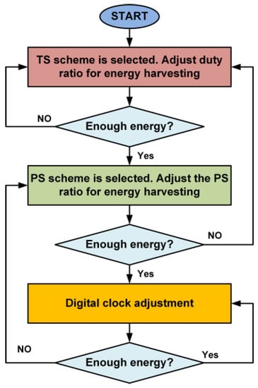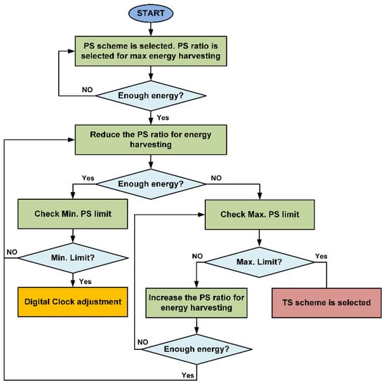 Figure 6. Flow diagram for the selection of the TS scheme, PS scheme and digital clock adjustment at the SWIPT receiver.