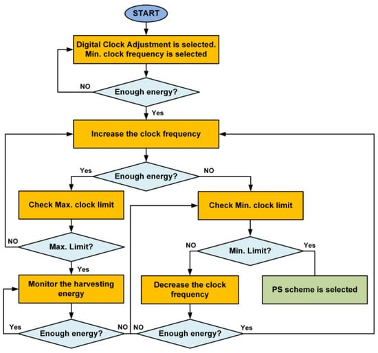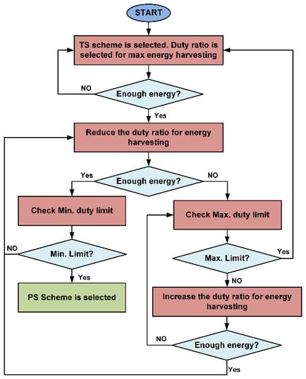 In the proposed design of the SWIPT system, the SWIPT transmitter acts as a master and the SWIPT receiver’s role is that of a slave. For the SWIPT system optimization, the STC controls the communication, RF power splitting scheme, energy harvesting duty cycle and digital clock frequency based on the harvested energy at the SWIPT receiver. Similarly, depending on the harvesting energy level at SWIPT receiver, the SWIPT transmitter can adjust the RF transmitted power, the selection between the LPDF/HPDF along with the appropriate modulation schemes to optimize the performance of the energy harvesting and data communication at the SWIPT receiver. Figure 6 shows the flow diagram for the selection of the TS scheme, PS scheme, and digital clock adjustment at the SWIPT receiver.