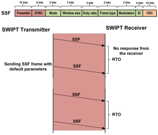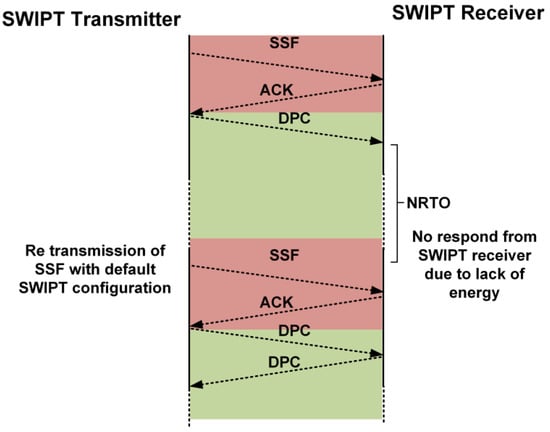 If the SWIPT transmitter does not receive any response during synchronization or during DPC, then after the no response timeout period (NRTO), the SWIPT transmitter switches to default communication and control parameters and starts sending the SSF frame. The reason for the lack of response from the SWIPT receiver is the absence of a sufficient available energy level at the supercapacitor. Thus, the SWIPT transmitter needs to initialize the synchronization operation again between the SWIPT transmitter and the receiver, as shown in Figure 14.