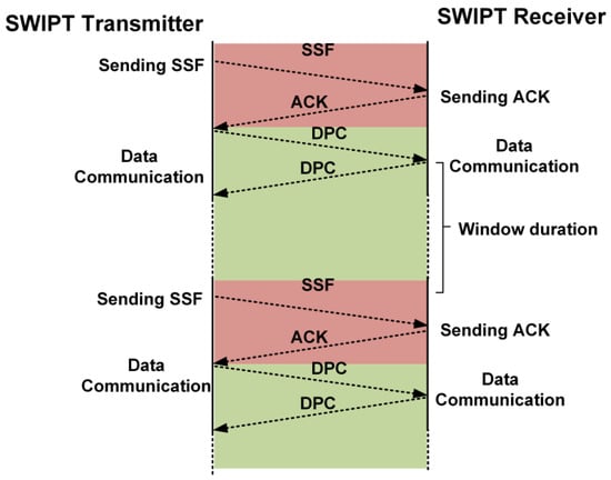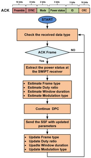 The bit sampling clock is recovered by the preamble in the transmitted data. The SYNC is used to align the frame structure and extract the data byte information. After decoding the received data, the SWIPT receiver extracts the control and communication parameters. The selection of the LPDF/HPDF in the DPC is selected as per frame type field in SSF. The duty ratio for energy harvesting is adjusted according to the SSF. The window duration (WD) for the DPC is also updated by the SSF frame. The modulation scheme is also updated by the SWIPT receiver according to the SSF frame. The SWIPT receiver updates all internal control counters and signals so that it is synchronized with the SWIPT transmitter. When the required energy for transmission is available in the supercapacitor, then the SWIPT receiver transmits the ACK frame. The ACK frame contains the current selected mode, power status and SWIPT receiver ID, at the SWIPT receiver. The SWIPT transmitter receives the ACK frame from the SWIPT receiver. After decoding the ACK frame, it extracts the power status at the SWIPT receiver. The SWIPT transmitter estimates the new values of parameters like duty ratio, RF transmitted power level, window duration, frame type, and modulation type. The SWIPT transmitter applies these updated values after sending these values to the SWIPT receiver in the next SSF frame, as shown in Figure 11. When the SWIPT transmitter obtains the ACK signal from the SWIPT receiver, this selects the frame type and modulation schemes depending on the power status for energy harvesting.