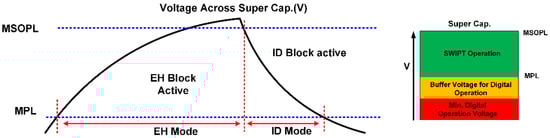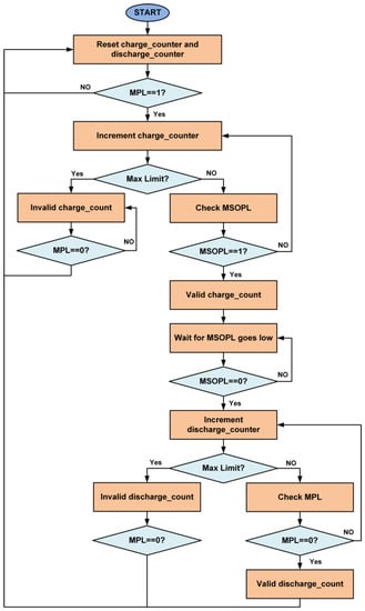Similarly, it monitors the discharge rate of the supercapacitor. Figure 15 shows the limits of the voltage across the supercapacitor for the estimation of power status and power consumption. The flow diagram for the estimation of power status is shown in Figure 16. Two counters are used for the calculation of time duration, which are the charge counter and the discharge counter. When the energy level at the supercapacitor is above the MPL limit, then the charge counter will start incrementing. The controller waits until the energy level in the supercapacitor exceeds the MSOPL limit. When the energy in the supercapacitor reaches the MSOPL limit then the charge counter value is considered as valid and it is used in the power status calculation. If the energy in the supercapacitor cannot reach the MSOPL limit, then the charge counter will reach its maximum counting limit. In this situation, the charge counter value is considered as invalid and cannot be used in power status calculation. For the estimation of the rate of power consumption at the SWIPT receiver, the discharge counter is used. When the energy level drops below the MSOPL limit, the discharge counter starts incrementing. It will keep incrementing until the energy level in the supercapacitor drops below the MPL limit. This provides the valid discharge counter value for the calculation of power consumption while performing the SWIPT operation. If the discharge counter reaches its maximum counting limit, then it will provide an invalid discharge counter value which cannot be used for power consumption calculation.